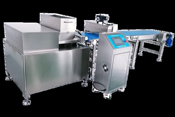 Dit industriële chocolade enrobeersysteem bestaat uit een precisie chocolade enrobeerder en een geïntegreerde koeltunnel, die een complete oplossing vormt voor hoogwaardige chocoladecoatingtoepassingen. Ontworpen met een minimale bandbreedte van 400 mm, sluit het systeem naadloos aan op eiwitreepvormmachines, met aanpasbare bandhoogte om perfecte uitlijning met upstream apparatuur te garanderen.