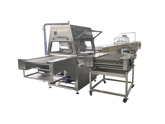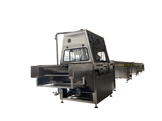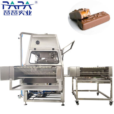 Deze professionele chocolade dompelmachine is speciaal ontworpen voor het efficiënt en uniform coaten van Snickers repen en andere gevulde chocoladerepen.